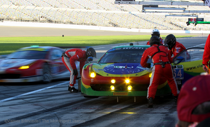 The works car suffered a spin at turn one quite early into the race, and an over exuberant re-entry by Dalla Lana caused a clutch failure which meant the car went back to the garage for a lengthy replacement.ย Even a few laps lost can spell โGame Overโ when the class leaders stay in touch with each other for the duration, so the long stop meant that the team was now in testing mode.ย Darren Turner who is normally good for an update during the race gave me a lovely yet memorably unprintable quote as he got back into the car on Sunday morning.ย Ever the professionals though, he and his co-drivers battled on and kept times up with the leaders until the end to help the car finish sixth as the team gained valuable data heading into Sebring and the WEC season.
