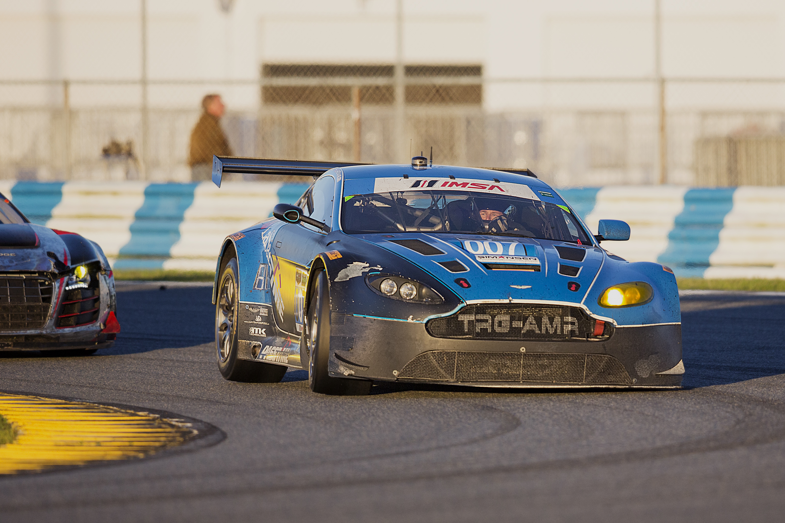 Obviously, casualties ensued.ย Once again the innocent TRG Aston #007 fell as a hapless victim, although not to the aforementioned passing tactics.ย During the evening hours and while comfortably on the lead lap, Brandon Davis was getting ready to pit and hand off to Nygaard when disaster struck.ย Quite literally!ย The required โgentleman driverโ in the AF Corse Ferrari – Francois Perrodo โ had a spin at the last turn of the infield section and in a moment lacking any sound judgement, attempted to rejoin the action as he pulled straight into the path of an accelerating Davis.ย The Ferrariโs race was over and the Aston, although seriously hobbled amid the resulting full course caution, made it back to the garage where extensive (and expensive!) repairs were effected.ย TRG team owner Kevin Buckler astounded the world media when he kept his cool and didnโt cause the TV censors to rush for the โbleepโ button.ย The Ferrari driver later made a full apology and took ownership of the incident, but Iโm sure Mr. Buckler would have been a lot happier if heโd offered to take ownership of the poor Aston as well!